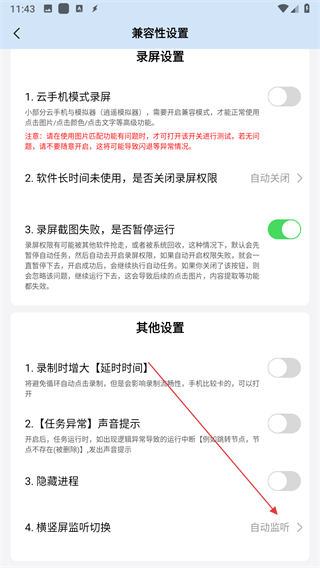 3、找到橫豎屏監(jiān)聽切換的選項,點擊進入屏幕類型選擇頁面。