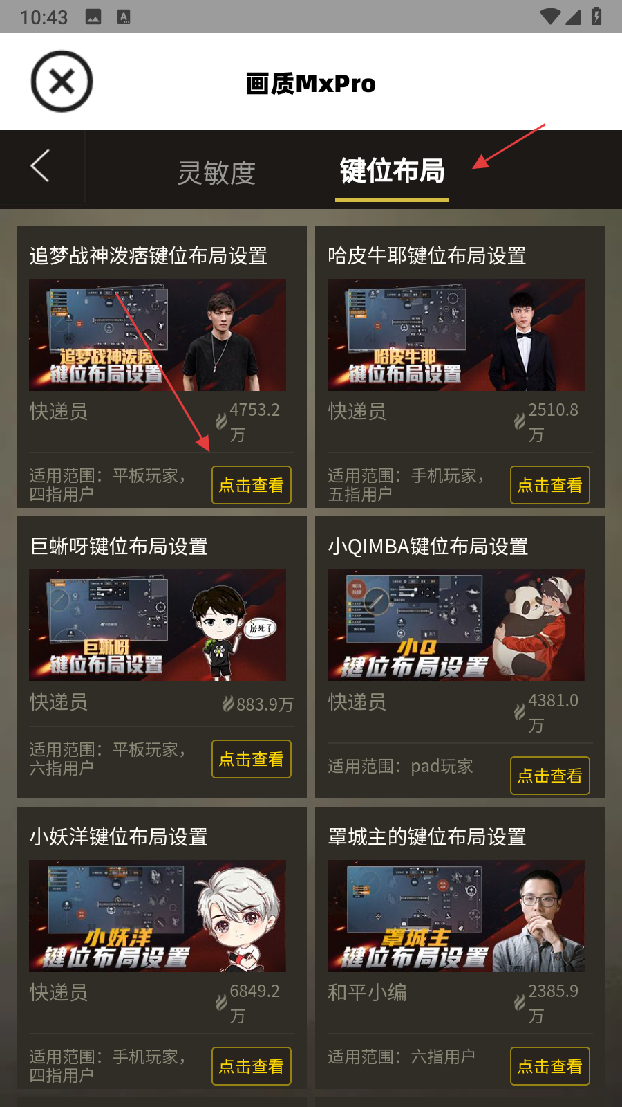 3、在鍵位布局界面,可查看各種大神鍵位,點擊對應鍵位卡片的點擊查看按鈕,可查看具體鍵位布局詳情。