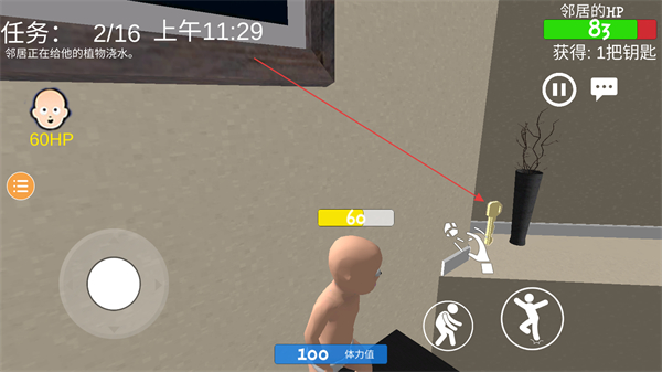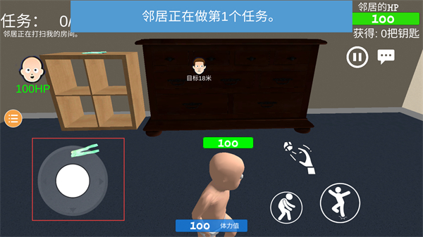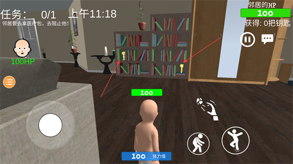 2、在場景中尋找金色鑰匙,如書架、角落等位置,同時要阻止鄰居完成任務。