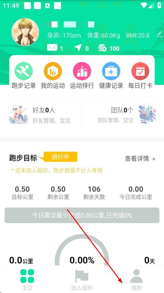 1、打開(kāi)位動(dòng)酷跑App,進(jìn)入主界面后,點(diǎn)擊底部導(dǎo)航欄中的我的選項(xiàng)。