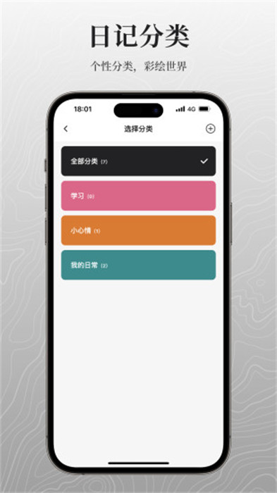 3、日記分類詳細(xì),不管是日?,嵤逻€是工作煩惱都能在不同的分類進(jìn)行記錄。