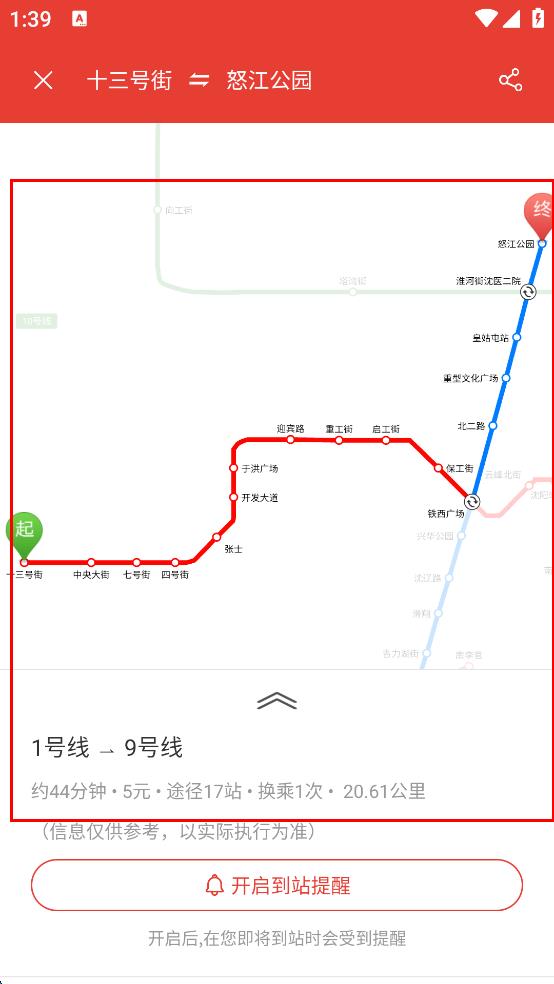 4、選好起始站和終點(diǎn)站后,APP會(huì)生成對(duì)應(yīng)的線路規(guī)劃,展示出換乘信息、所需時(shí)間、票價(jià)等內(nèi)容,還可開(kāi)啟到站提醒。