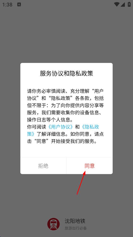 1、打開(kāi)沈陽(yáng)地鐵APP,在服務(wù)協(xié)議和隱私政策界面,仔細(xì)閱讀相關(guān)內(nèi)容后,點(diǎn)擊同意,進(jìn)入APP主界面。