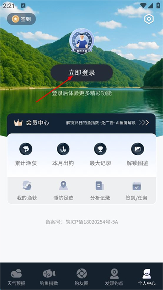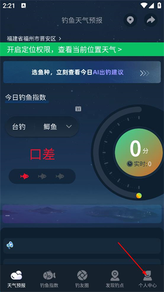 1、打開釣魚天氣預(yù)報(bào),點(diǎn)擊右下角個(gè)人中心。