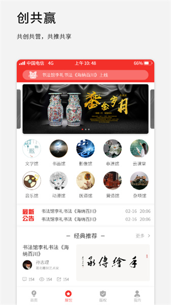 平臺(tái)提供多種的作品分類管理:美術(shù)作品、音樂作品、攝影作品、企業(yè)版權(quán)著作等等,每日也會(huì)有更多的全新熱門推薦產(chǎn)品,遇到喜愛的原創(chuàng)作者可以一鍵關(guān)注訂閱,如果有上新作品會(huì)第一時(shí)間通知用戶們上線欣賞最新的產(chǎn)品,更可以與在線用戶們互相溝通交流,進(jìn)行更多藝術(shù)作品間的相互交流,從中也可以了解各地區(qū)的博物館活動(dòng)信息,了解各種活動(dòng)發(fā)布內(nèi)容。