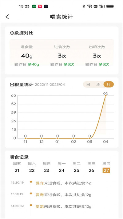 1、軟件上面每天都會顯示喂食器和飲水器的剩余量,這樣能提醒主人添糧。