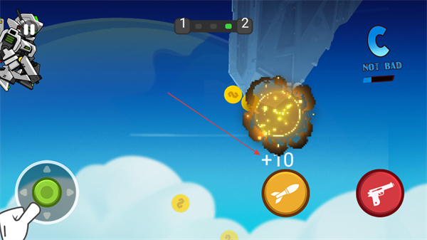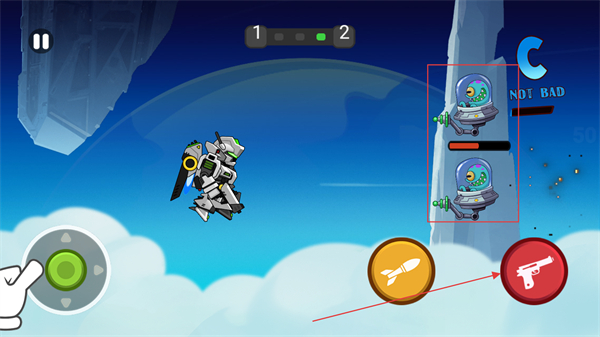 2、瞄準(zhǔn)敵方飛船,點(diǎn)擊攻擊按鈕發(fā)射子彈,點(diǎn)擊技能按鈕釋放火箭。