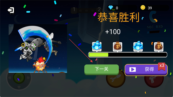 4、成功消滅所有敵方飛船后,游戲會(huì)顯示恭喜勝利界面,點(diǎn)擊下一關(guān)按鈕。