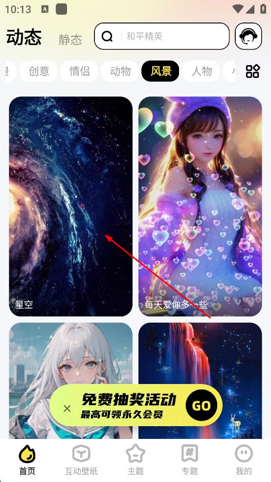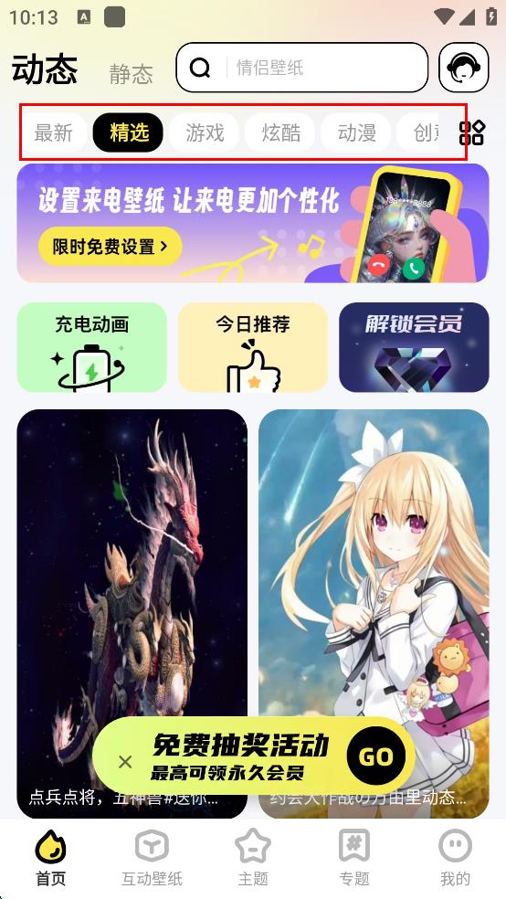 1、打開壁紙軟件,在頂部的分類標(biāo)簽中,可根據(jù)需求選擇不同類型,瀏覽相關(guān)動態(tài)壁紙。