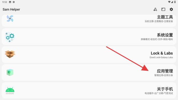 1、啟動三星工具箱應(yīng)用軟件,向下滑動找到并點擊應(yīng)用管理的按鈕。