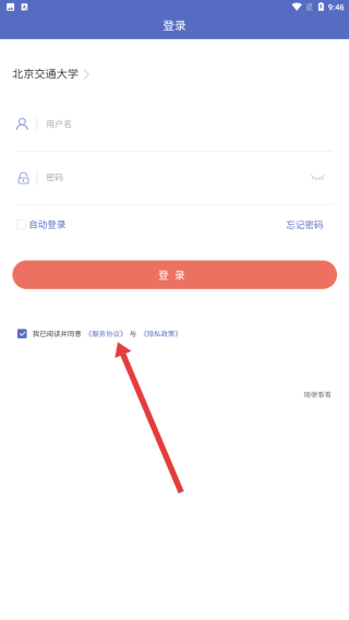 2、登錄頁面中,找到并點擊《服務協(xié)議》鏈接,進入?yún)f(xié)議查看界面。
