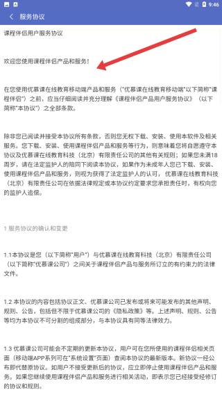 3、進入服務協(xié)議頁面后,開始瀏覽閱讀協(xié)議內(nèi)容,了解課程平臺的服務規(guī)則與條款。