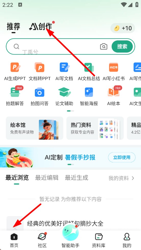 1、打開百度文庫APP,進入首頁界面,點擊上方的AI創(chuàng)作。