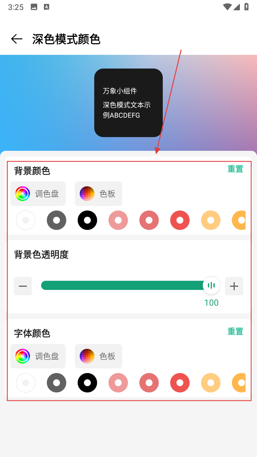 4、在深色模式顏色設置頁面,可通過調(diào)色盤,色板選擇背景顏色、字體顏色,還能調(diào)整背景色透明度。