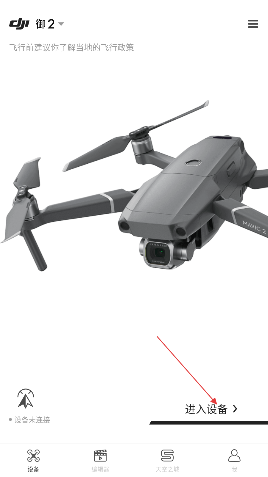 1、打開軟件進入主界面,查看設(shè)備未連接提示后點擊進入設(shè)備選項,準備進行無人機連接操作。