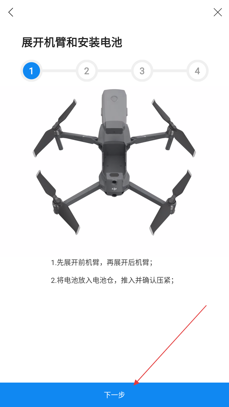 3、根據(jù)提示點擊下一步完成步驟,完成無人機準備后,即可連接上無人機。