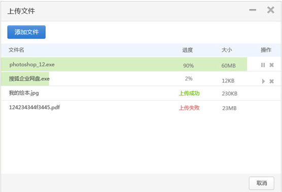 彈出上傳對話框,點擊“添加文件”,選擇要上傳的文件,上傳列表顯示文件名、進度、大小,上傳過程中可以暫停/恢復上傳、取消上傳.