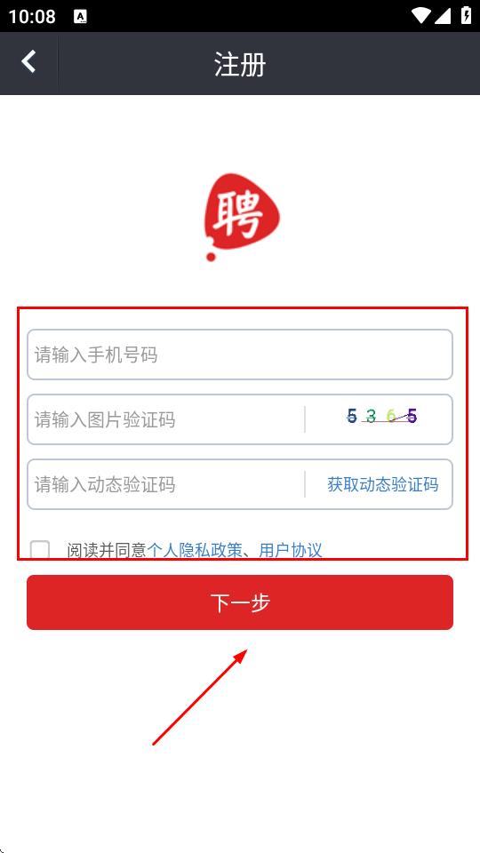 4、在注冊(cè)頁(yè)面,輸入手機(jī)號(hào)碼、圖片驗(yàn)證碼,輸入動(dòng)態(tài)驗(yàn)證碼,勾選同意個(gè)人隱私政策和用戶協(xié)議,點(diǎn)擊下一步。