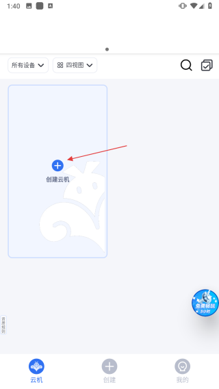 1、打開VMOS云手機(jī)應(yīng)用,在云機(jī)頁(yè)面點(diǎn)擊創(chuàng)建云機(jī)的藍(lán)色加號(hào)按鈕。