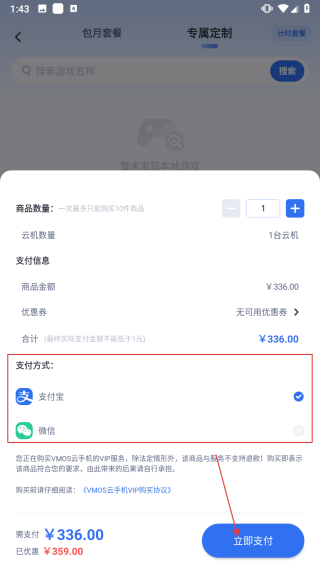 4、選好套餐后,確認(rèn)商品數(shù)量、云機(jī)數(shù)量,選擇支付方式,點(diǎn)擊立即支付按鈕完成付款。