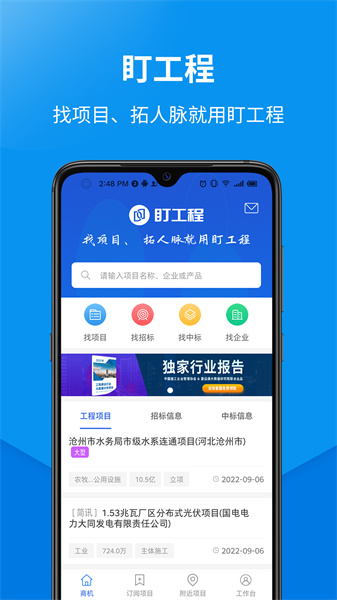 盯工程官方版是一款可以帶來更安全的建筑工程項目信息服務平臺,為建筑工程信息服務提供了大數(shù)據(jù)的信息分析和處理,為建筑行業(yè)的人員提供建材、設備、分包等建筑行業(yè)銷售人員服務,讓項目更高效業(yè)績也在不斷提高。