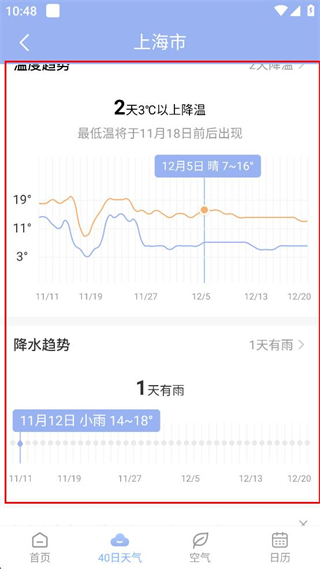 4、查看上海市的溫度趨勢和降水趨勢圖表,掌握天氣變化規(guī)律。