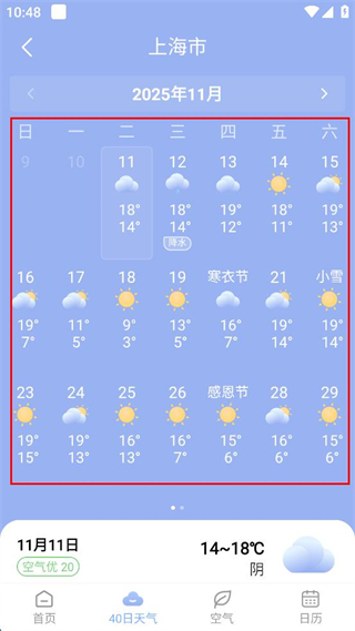 3、查看2025年11月上海市的天氣日歷,了解每日天氣情況。