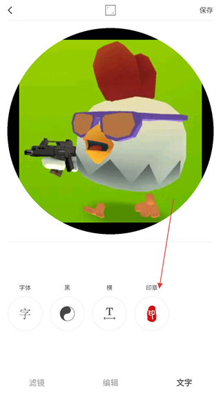 2、進入編輯界面后,點擊下方文字選項,在出現(xiàn)的功能按鈕中,點擊印章按鈕。