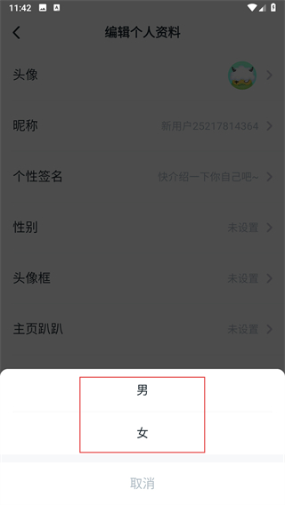 4、在彈出的性別選擇框中,可選擇男或女。