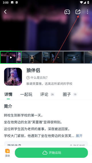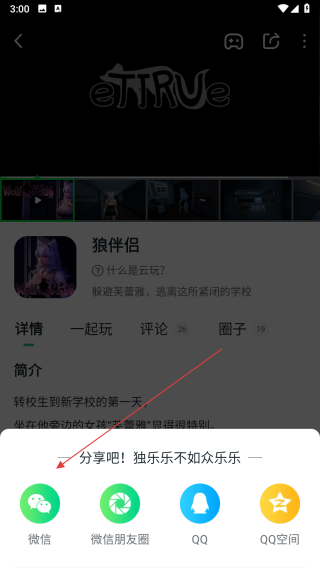 2、在游戲詳情頁(yè)右上角,找到帶箭頭的分享圖標(biāo)并點(diǎn)擊,彈出分享選項(xiàng)菜單,顯示微信、微信朋友圈、QQ、QQ空間等分享渠道。