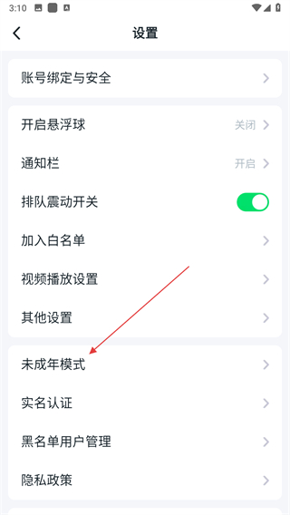 2、在設(shè)置頁(yè)面中,向下滑動(dòng)找到未成年模式選項(xiàng),點(diǎn)擊進(jìn)入設(shè)置界面。