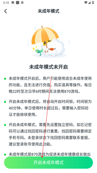 3、在未成年模式界面,閱讀相關(guān)說(shuō)明后,點(diǎn)擊綠色的開(kāi)啟未成年模式按鈕。
