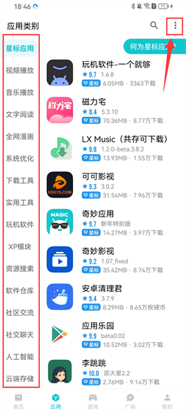 2、點(diǎn)擊應(yīng)用欄目,給大家根據(jù)不同的軟件類型進(jìn)行了細(xì)致劃分,用戶可以根據(jù)分類快速找到需要的軟件,同時(shí)也可以單機(jī)右上角的三個(gè)點(diǎn)標(biāo)志;