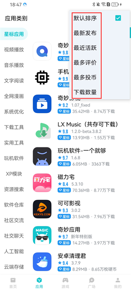 3、點(diǎn)擊三個(gè)點(diǎn)標(biāo)志則會(huì)出現(xiàn)不同的排序,有最新發(fā)布/最近活躍/最多評(píng)價(jià)/最多投幣/下載數(shù)量不同的排序;