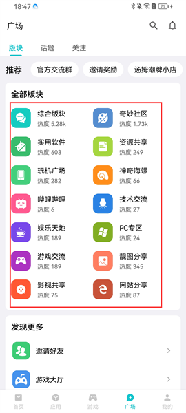 5、點(diǎn)擊廣場(chǎng)欄目,則有豐富的不同的廣場(chǎng)板塊,地喜愛同時(shí)現(xiàn)實(shí)熱度量,用戶可以選擇自己感興趣的話題與網(wǎng)友進(jìn)行討論。