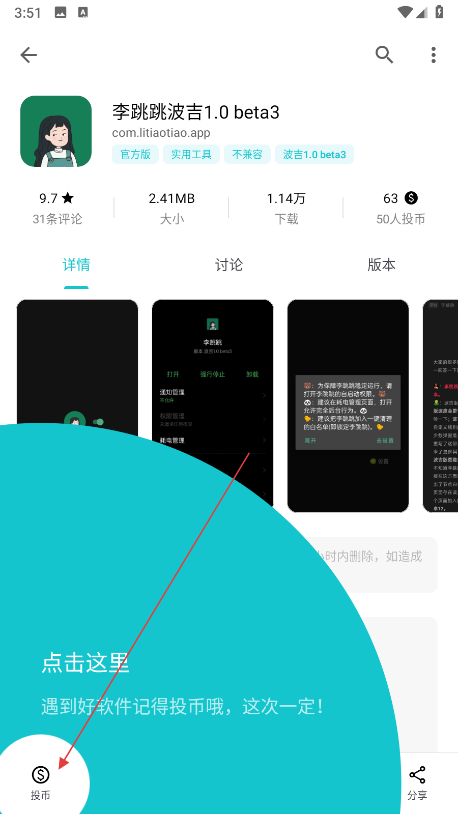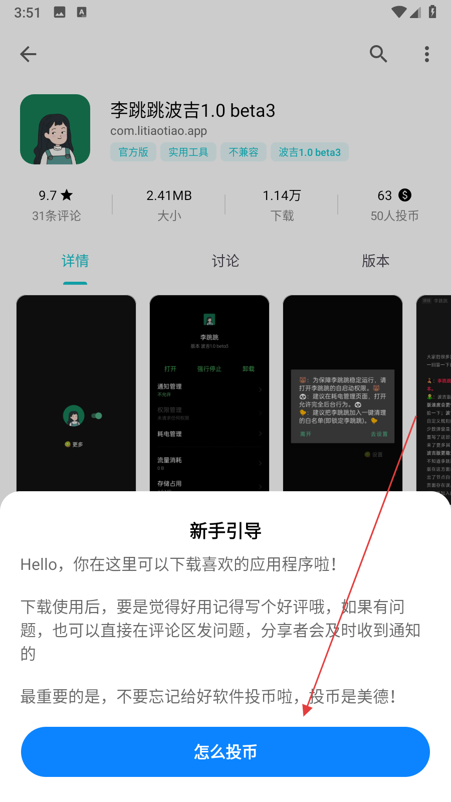 1、在奇妙應(yīng)用中找到想要投幣的應(yīng)用,點(diǎn)擊進(jìn)入該應(yīng)用的詳情頁(yè)面,在頁(yè)面下方會(huì)看到新手引導(dǎo)提示框,點(diǎn)擊其中的怎么投幣按鈕。