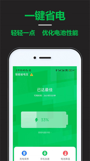 智能省電寶手機版是一款能夠幫助用戶解決手機續(xù)航問題延長手機電池壽命的智能省電軟件,這款軟件能夠?qū)崟r對手機的耗電情況進行監(jiān)測,并對各項耗電軟件提供識別和優(yōu)化,對于軟件的耗電情況還會為您做出數(shù)據(jù)表報,讓您能夠直觀的感受到什么軟件耗電最快,從而提出解決的方法和建議,使用這款軟件后能夠讓用戶的手機充電頻率大大降低,從而延長手機的使用時間,幫助用戶隨時掌握手機的運行狀態(tài)。