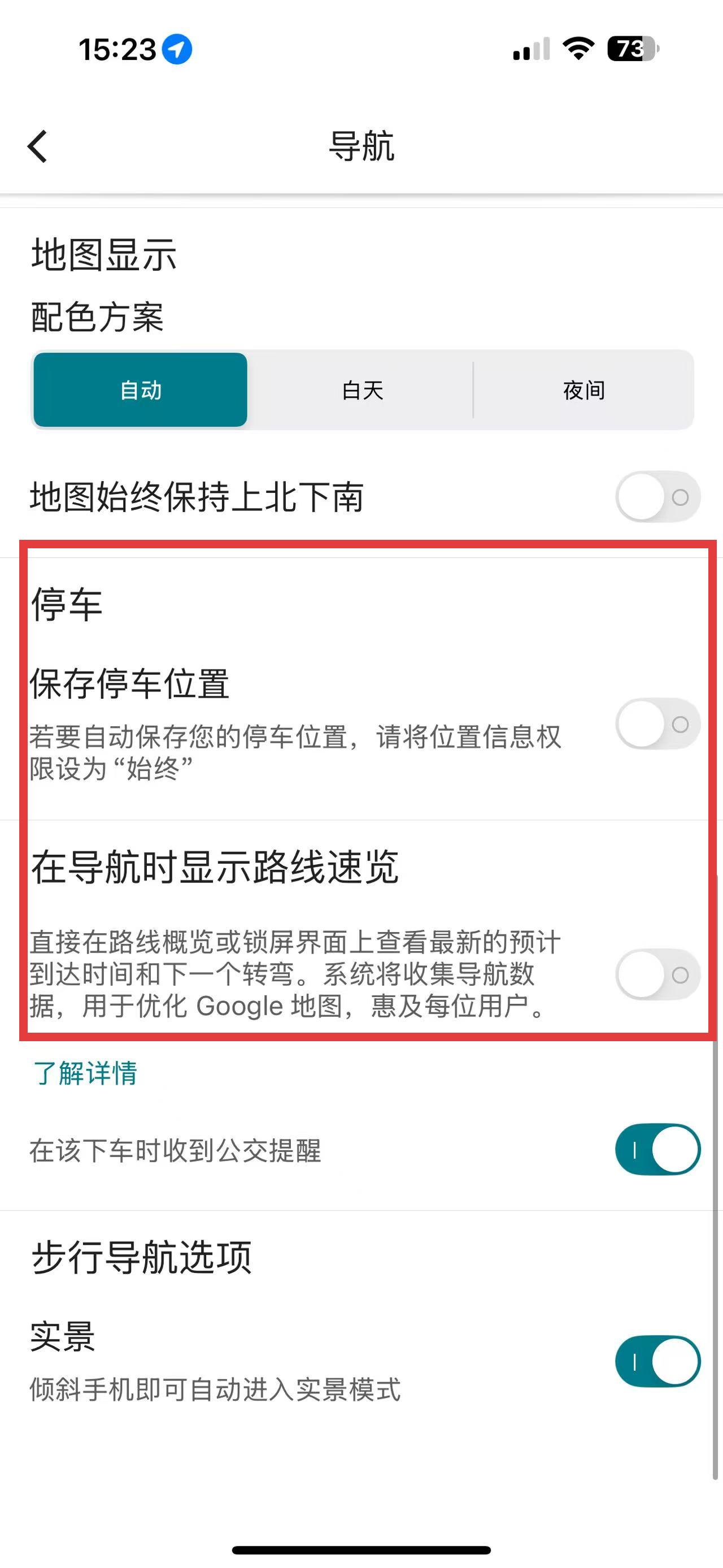 3、在導(dǎo)航設(shè)置界面里,找到停車板塊。如需自動保存停車位置,點(diǎn)擊保存停車位置右側(cè)的開關(guān)按鈕將其開啟。