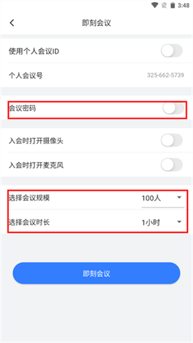 2.進(jìn)去后可以設(shè)置會(huì)議的進(jìn)入密碼,根據(jù)需求設(shè)置會(huì)議規(guī)模和開(kāi)會(huì)時(shí)長(zhǎng),設(shè)置完成后點(diǎn)擊【即刻會(huì)議】就能將本次的會(huì)議號(hào)和會(huì)議密碼發(fā)送給參加會(huì)議人員即可;