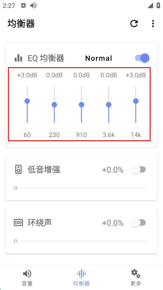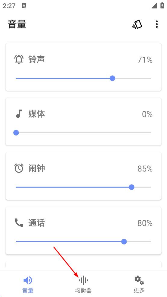 2、在音量設(shè)置頁面,點擊底部“均衡器”,進入均衡器設(shè)置頁面。