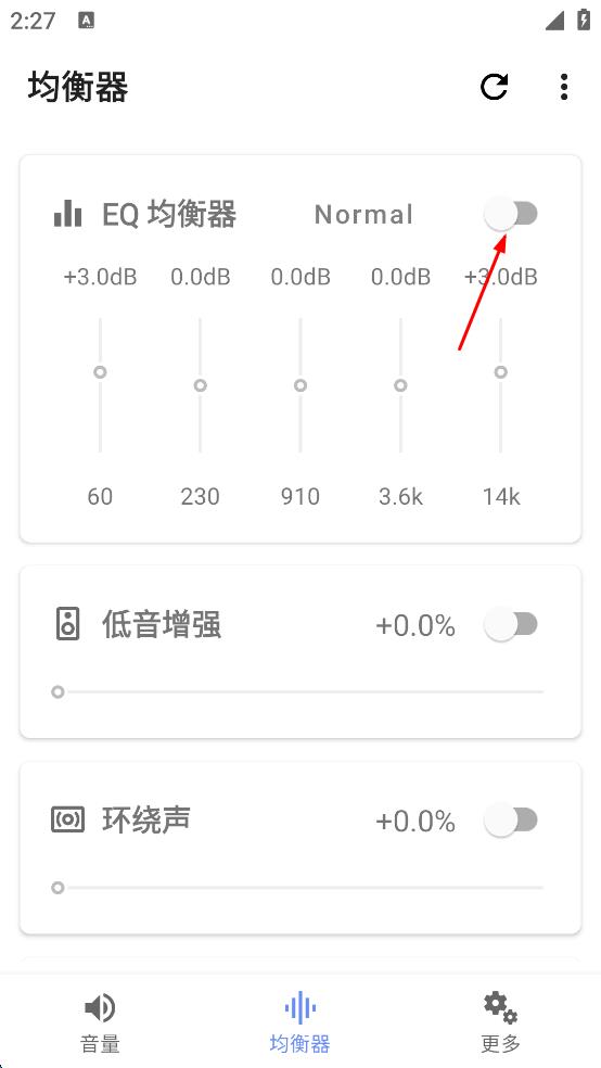 3、在均衡器設(shè)置頁面,找到“EQ均衡器”,點擊其右側(cè)的開關(guān)按鈕將其開啟。