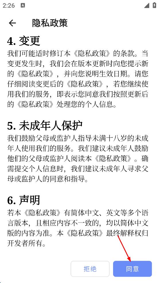 1、打開音樂調(diào)節(jié)類APP,出現(xiàn)隱私政策界面,仔細(xì)閱讀后點擊“同意”,進入音量設(shè)置頁面。