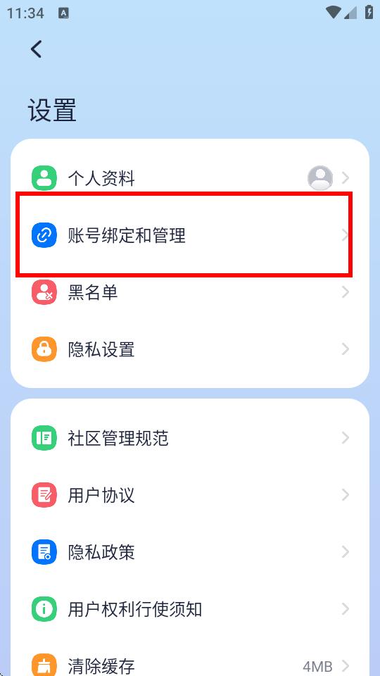 3、在設(shè)置界面中,找到并點(diǎn)擊賬號(hào)綁定和管理選項(xiàng)。