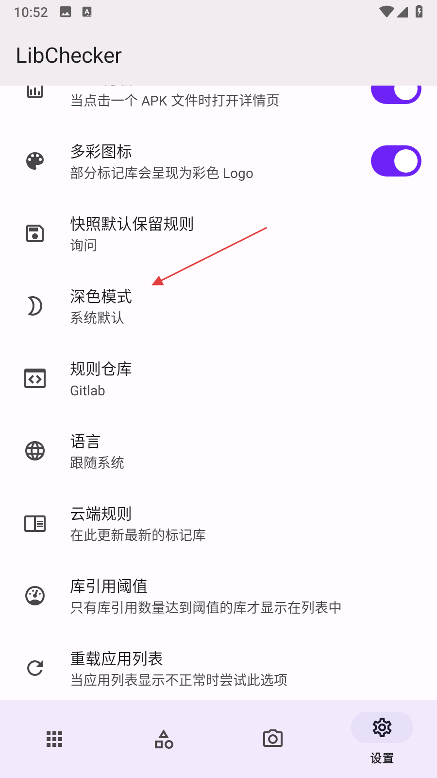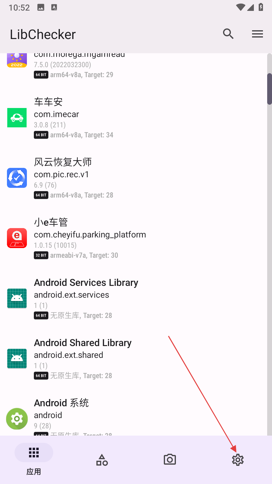 1、打開LibChecker應用,點擊底部導航欄最右側的齒輪形狀設置圖標,進入設置頁面。