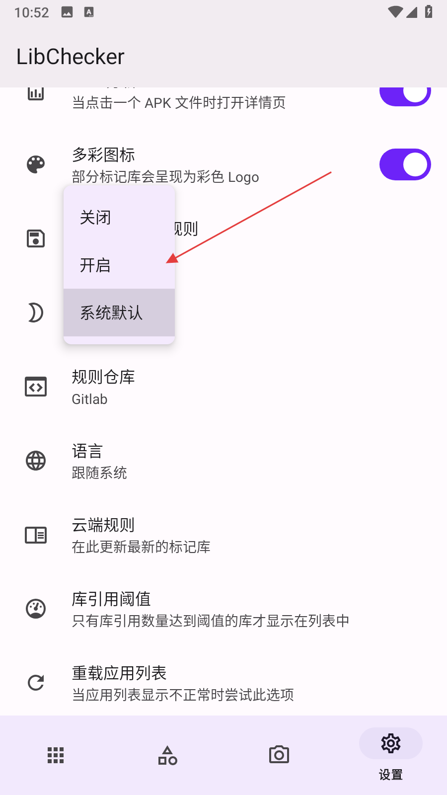 3、在選擇框中點擊開啟選項,即可將LibChecker的界面切換為深色模式。