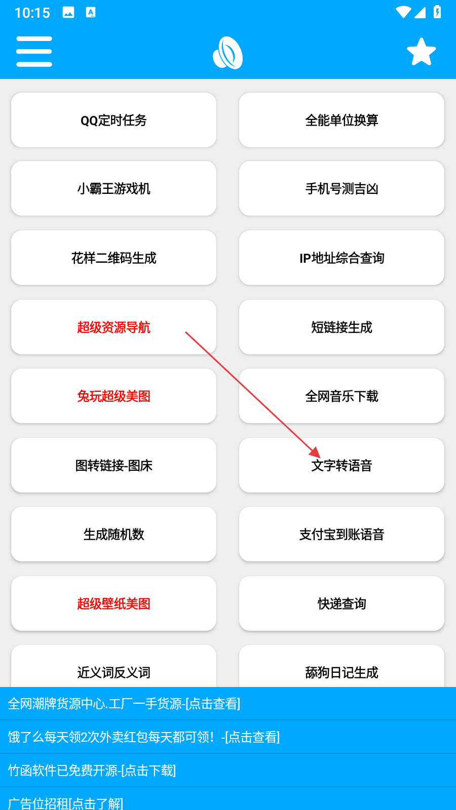 1、打開(kāi)竹函應(yīng)用,在功能列表中找到文字轉(zhuǎn)語(yǔ)音選項(xiàng)并點(diǎn)擊,進(jìn)入文字轉(zhuǎn)語(yǔ)音界面。