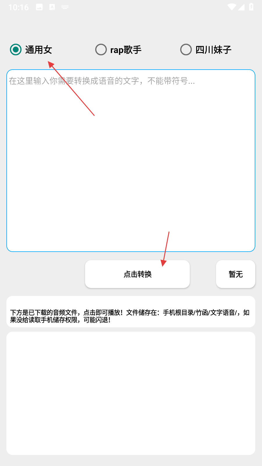 2、選擇語(yǔ)音類型,在輸入框中輸入需要轉(zhuǎn)換的文字,點(diǎn)擊點(diǎn)擊轉(zhuǎn)換按鈕。