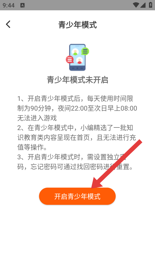 3、在青少年模式說明頁面,點擊開啟青少年模式按鈕,進(jìn)入密碼輸入界面。
