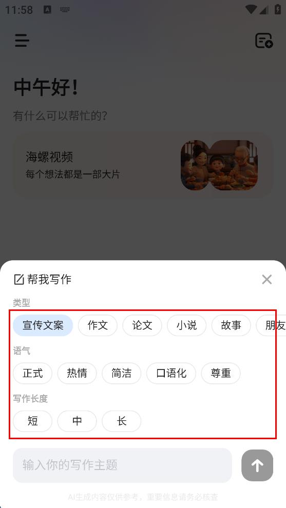 4、設(shè)置好寫作類型、語氣和長度后,在“輸入你的寫作主題”欄填寫寫作主題,之后軟件會(huì)生成相應(yīng)的寫作內(nèi)容,完成幫我寫作操作。