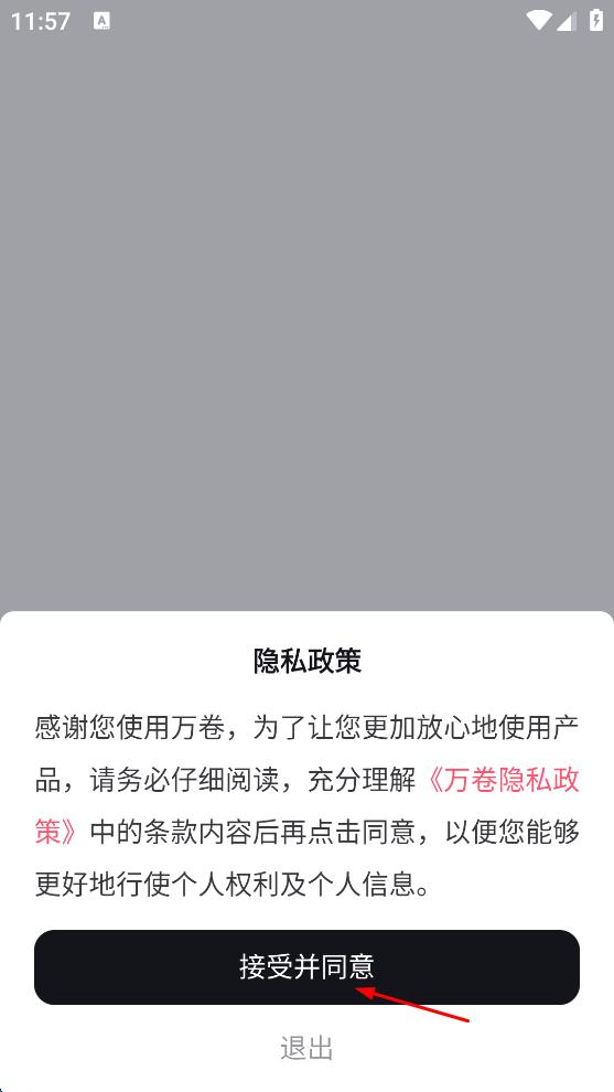 1、打開萬卷軟件,彈出“隱私政策”提示彈窗,閱讀相關(guān)內(nèi)容后,點(diǎn)擊“接受并同意”,進(jìn)入軟件主界面。